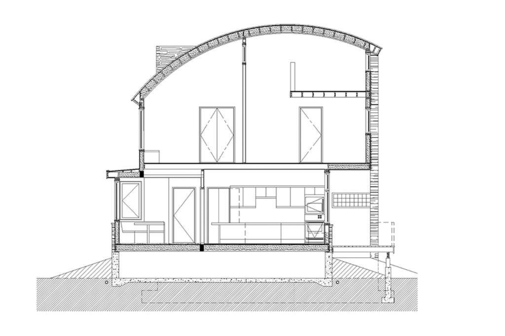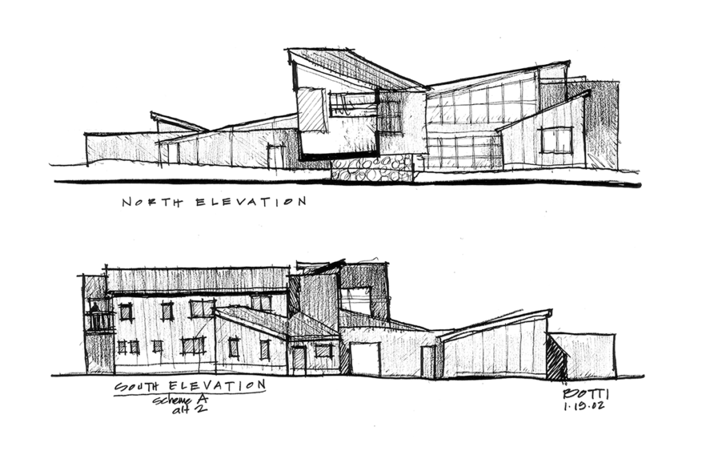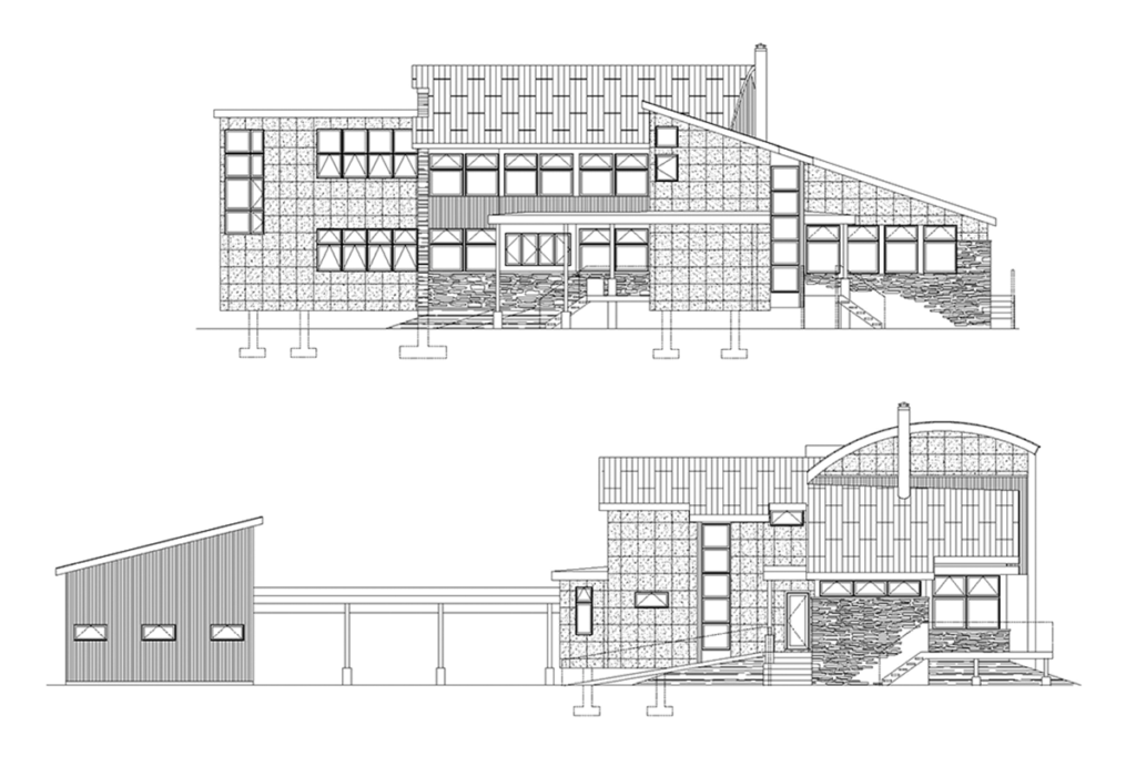 Our design was based on the entry sequence and circulation into the house. As you came in, you cut into an axis that opened up as you moved into the house. As this path passed through the living room and passed the fireplace, it opened up into grand views of the forest (and sometimes creek) outside. There was another path that crossed this entry sequence which tied together the rest of the house. It went along the back of the living area, crossing the living room in front of the fireplace (which becomes the knuckle between the two paths), and then through the kitchen, and ending up in a stair to the second floor bedrooms. This cross axis scheme created a complex massing that we articulated through the use of different materials and formal volumes.