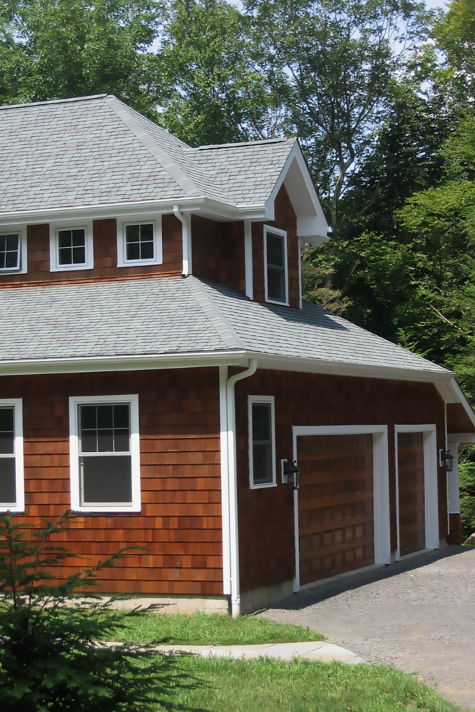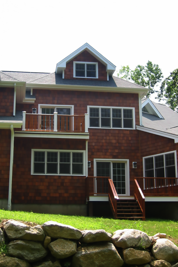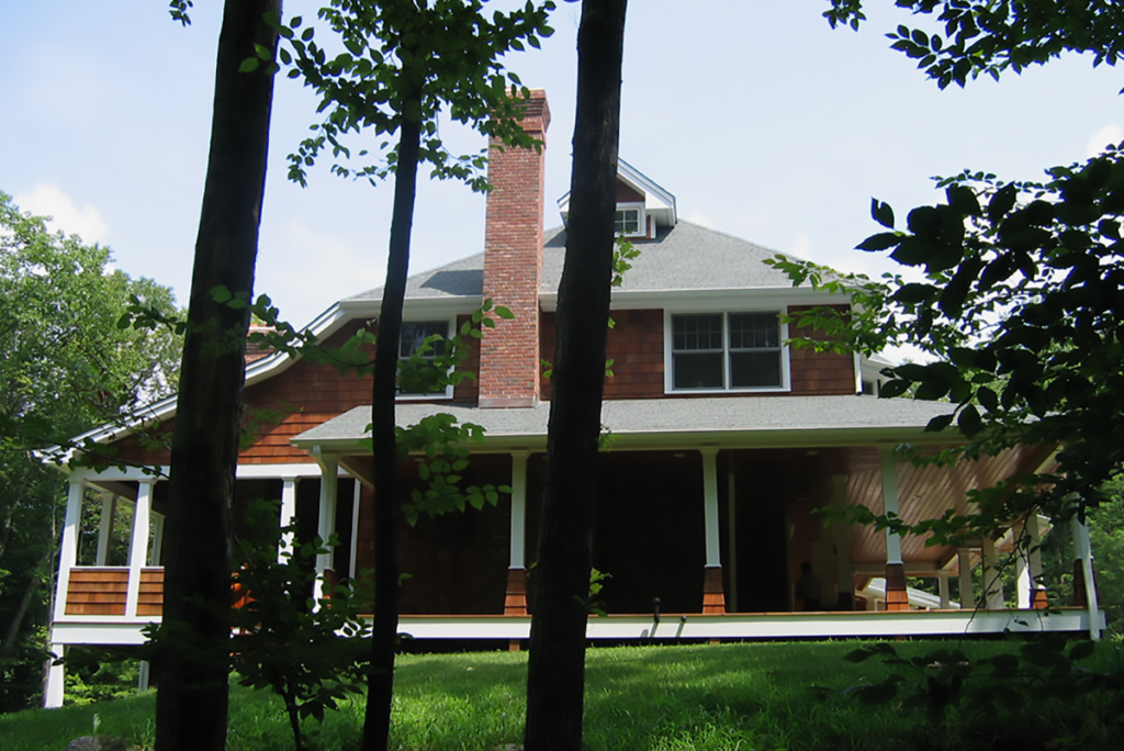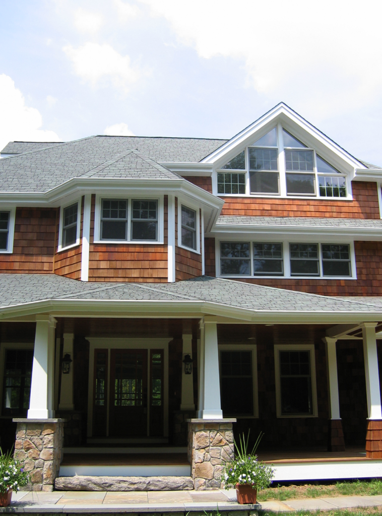 This speculative house was done for a builder we had worked with on several other projects. In retrospect this could be seen as a refined McMansion. The goal of the design was to break-up the almost 10,000 sf of interior living space. We did this in plan by constantly changing the angle from one part of the house to the next. We were thus able to break down the massing in several smaller pieces. Then in section, using the porch, its roof, and then setting back the second floor, creating more roof, we hid much of the house under a roof that was almost continuous. Using a hip roof instead of a gable furthered this illusion. The angles of the plan created a roof with a continuously changing surface that did not allow the eye to rest or realize how large the whole volume truly was.