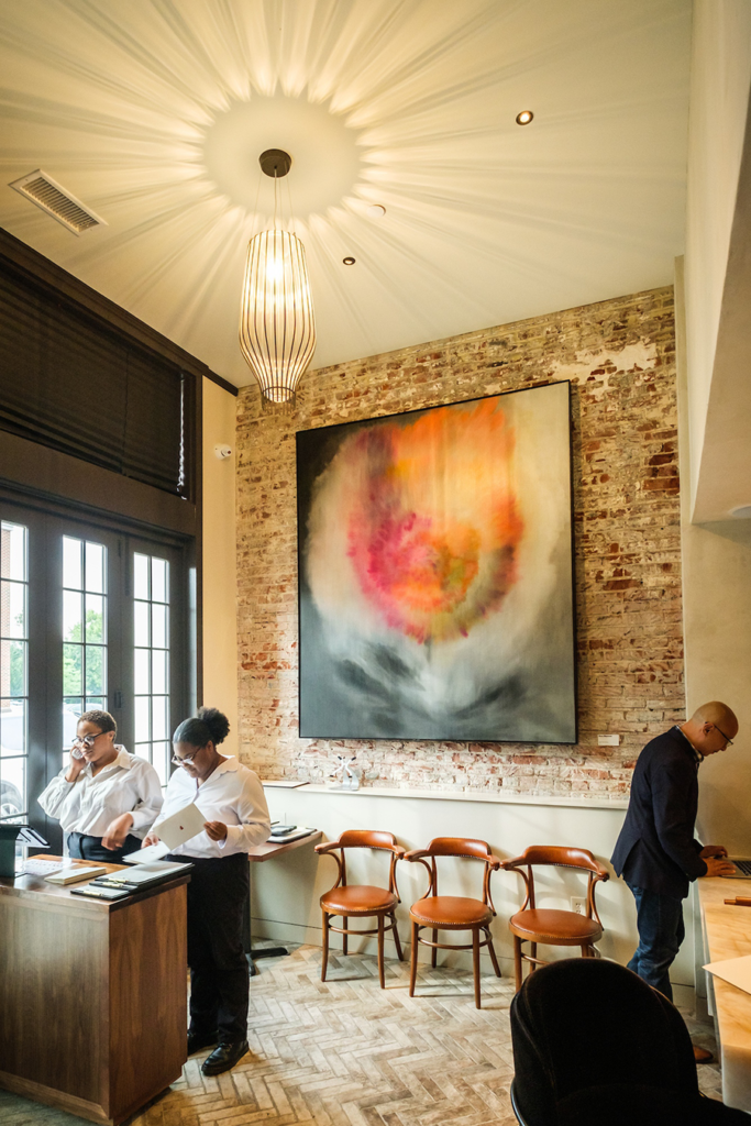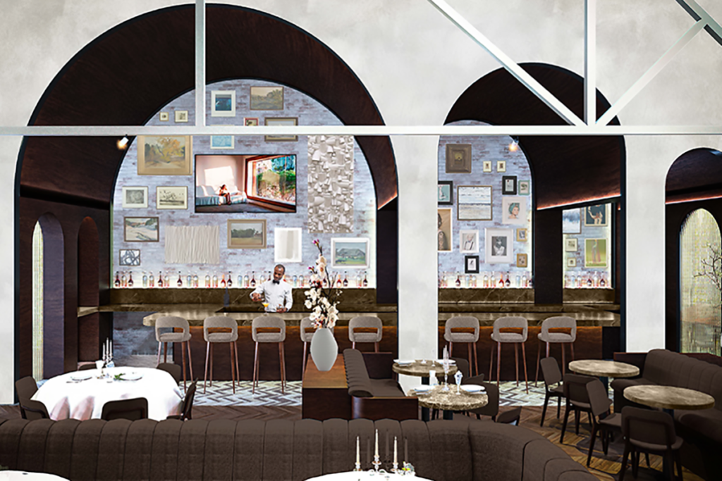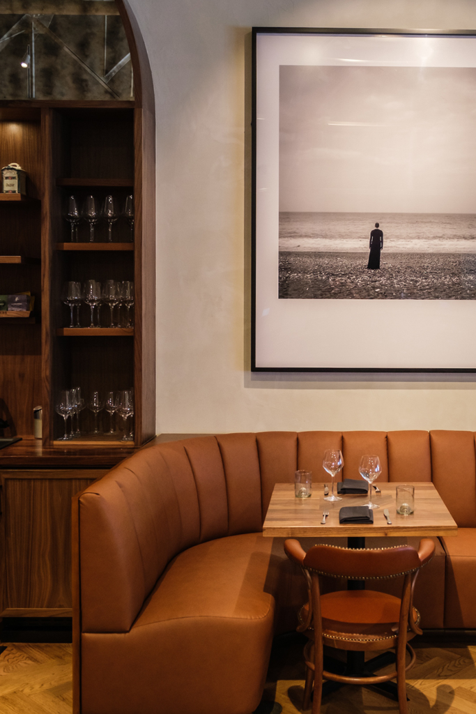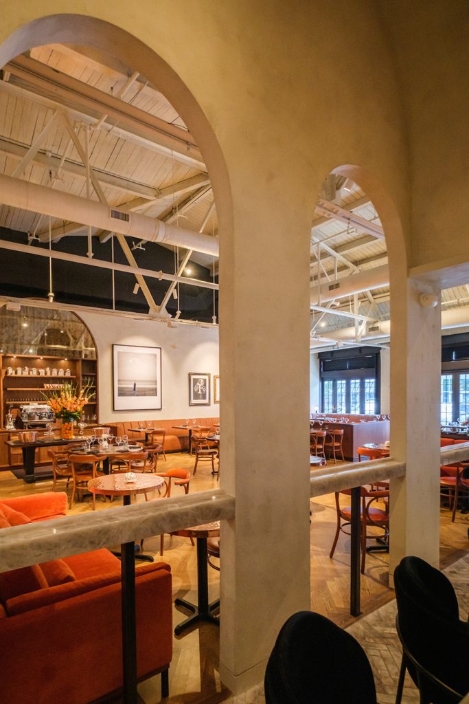 The space is divided into three zones. The central street, where the individual dining tables are located; the enclosed archways containing the entry, bar, private dining, and wine cellar, and the banquettes. The metaphor of the street with an arched facade on one side and open park with beautiful views (in the form of exquisite artworks) on the other is brought inside a formerly industrial space that vanishes as the smells, tastes, sights, and sounds of the steakhouse take over.