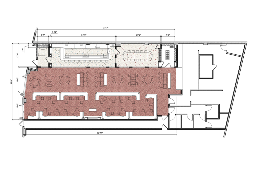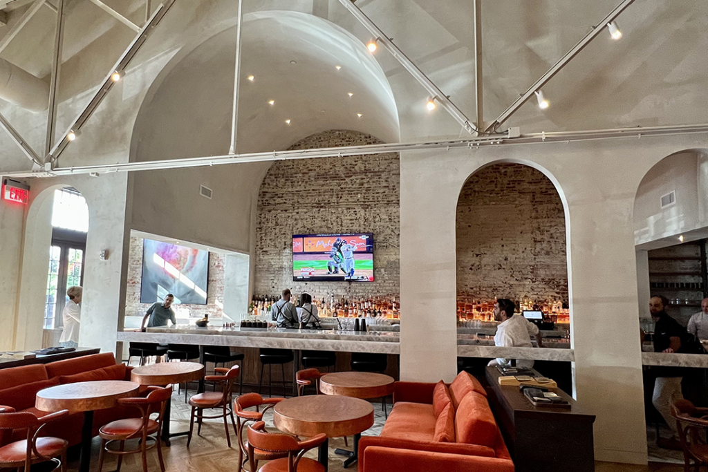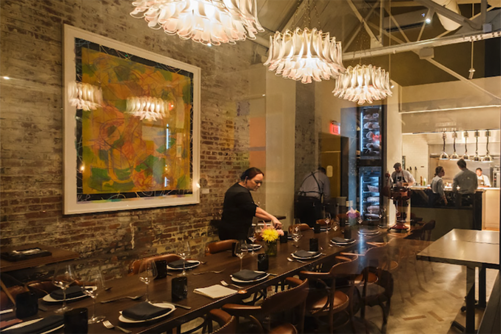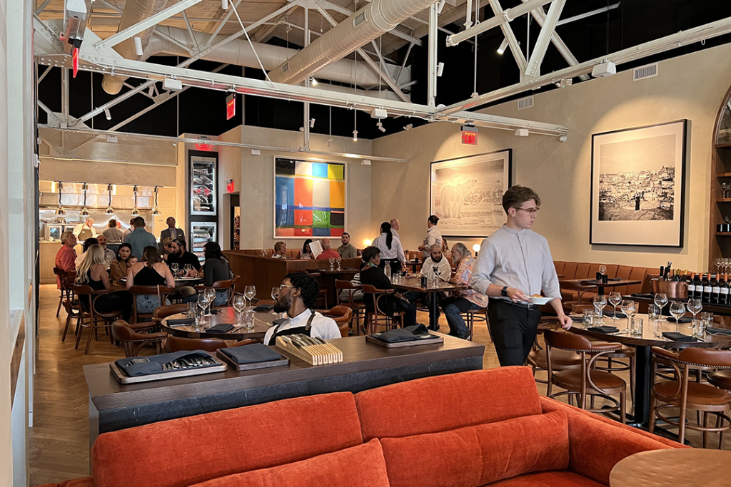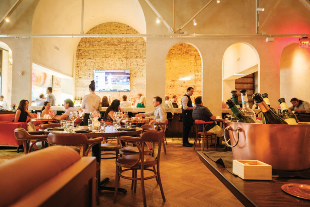 The space is divided into three zones. The central street, where the individual dining tables are located; the enclosed archways containing the entry, bar, private dining, and wine cellar, and the banquettes. The metaphor of the street with an arched facade on one side and open park with beautiful views (in the form of exquisite artworks) on the other is brought inside a formerly industrial space that vanishes as the smells, tastes, sights, and sounds of the steakhouse take over.