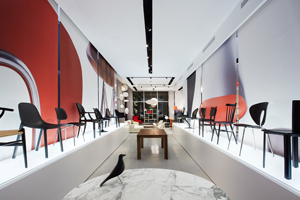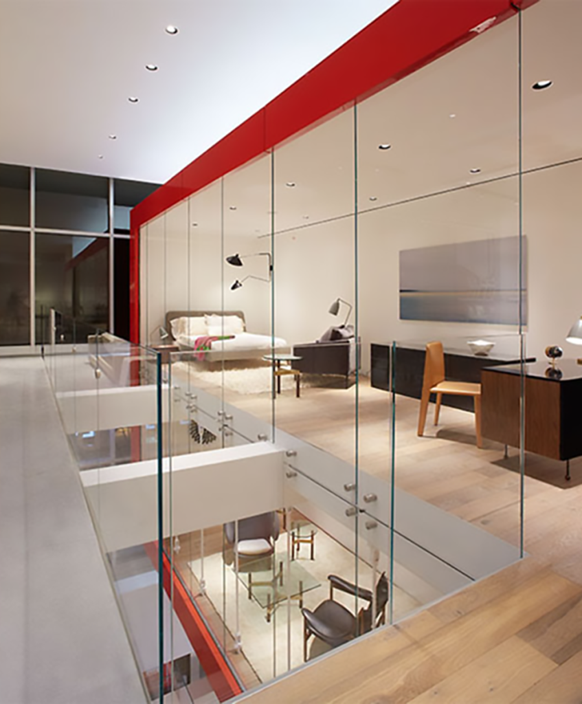 Situated on the corner of 57th Street and 3rd Avenue, the new Design Within Reach studio occupies a small footprint at the ground level and the entire basement, second, and third floors of the building. To create a powerful impact, the design places a floating red box above the entrance, providing a 24′ ceiling height at the ground floor. The floating box creates a strong brand identity on the street level as well as accommodates a duplex apartment.