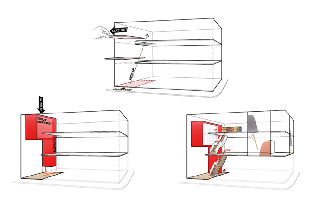 The idea behind the duplex apartment facing the 2nd and 3rd floor is to explore the voyeuristic experience one has living in New York City. In a dense city like New York, we always end up looking into others’ apartments.