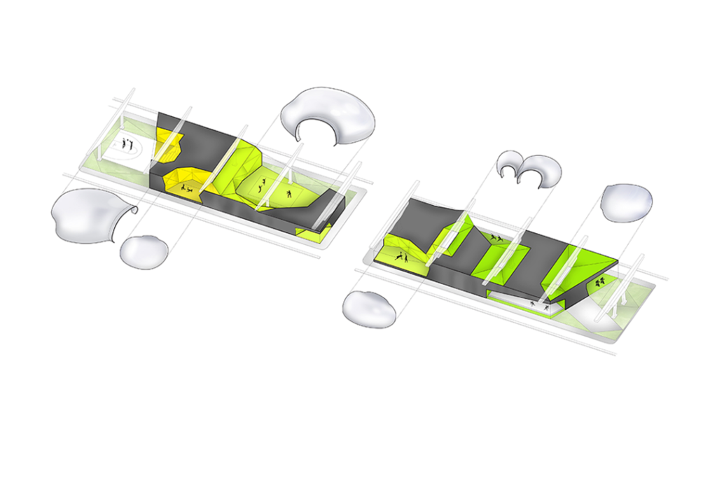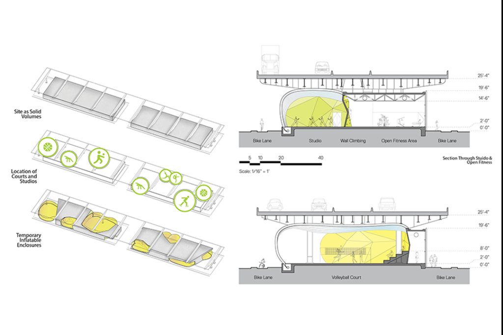 The 2nd proposal looks at a program that addresses the noise issues underneath the highway — a sports facility. The design proposes an inflatable structure for high intensity sport/ play areas (basketball and volleyball etc), to be used in extreme winter conditions but open throughout the year otherwise.