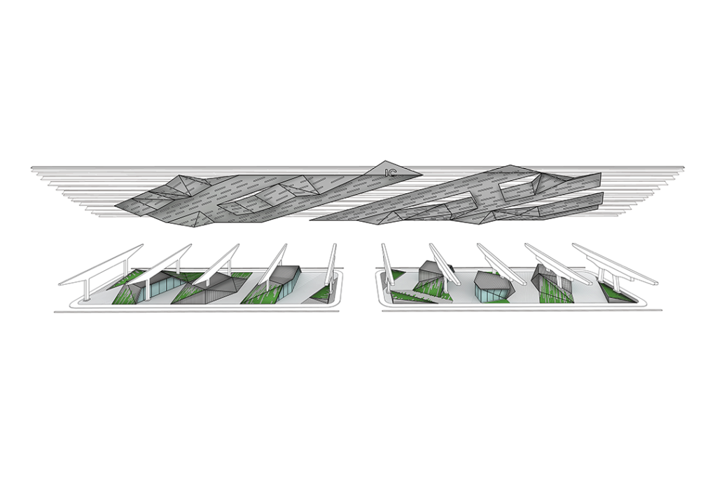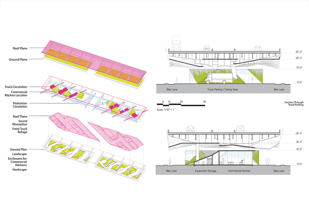 The 1st option examines the potential of the site as a food distribution center. Proposing a folding landscape and roof-scape that defines commercial kitchens which service food trucks during the morning and neighborhood tenants at lunch.