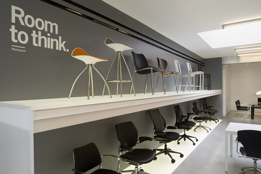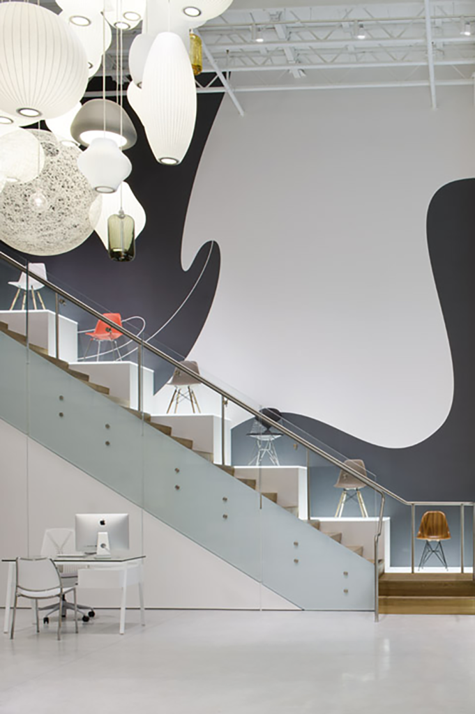 To create an impactful presentation, a double height lighting cloud and swatch wall are placed at the entrance. New stairs with illuminated merchandising and super graphics lead customers to the second floor.
