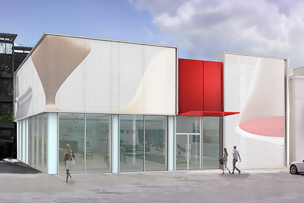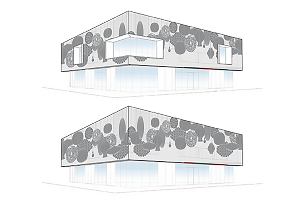 Layering – Using a metal or fabric exterior scrim to provide an impactful façade and continue the strong graphics that are used in the interior as well.