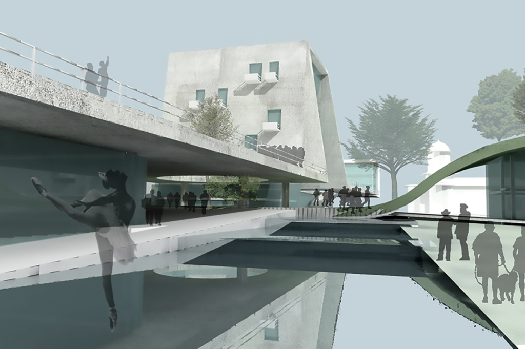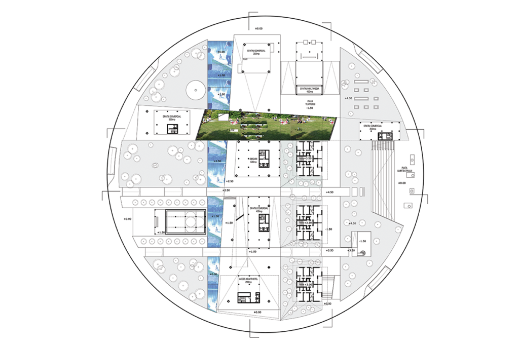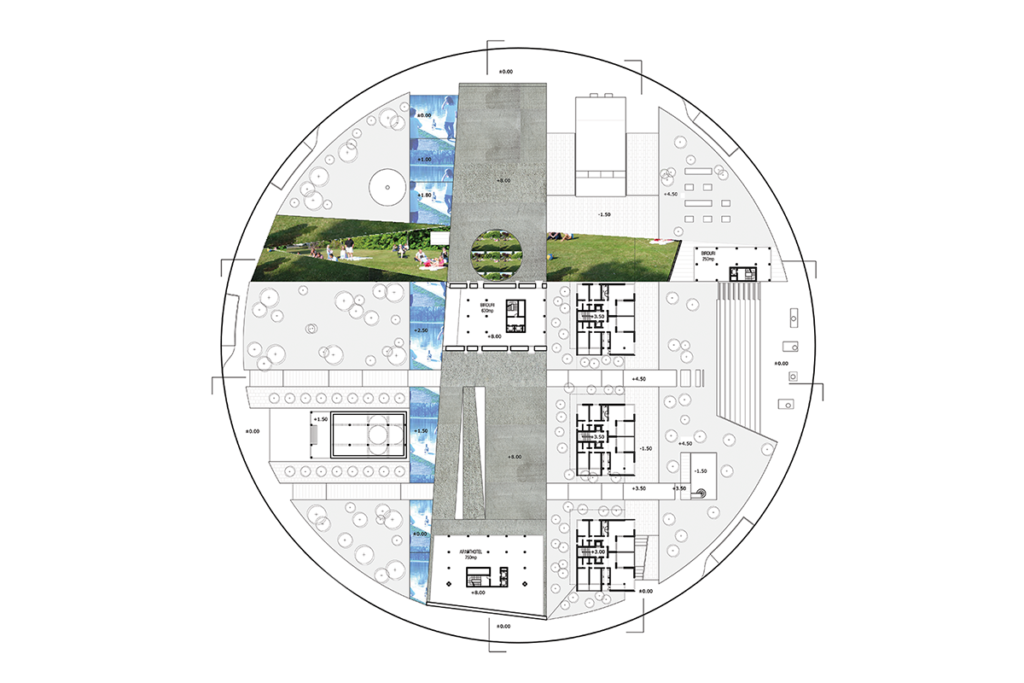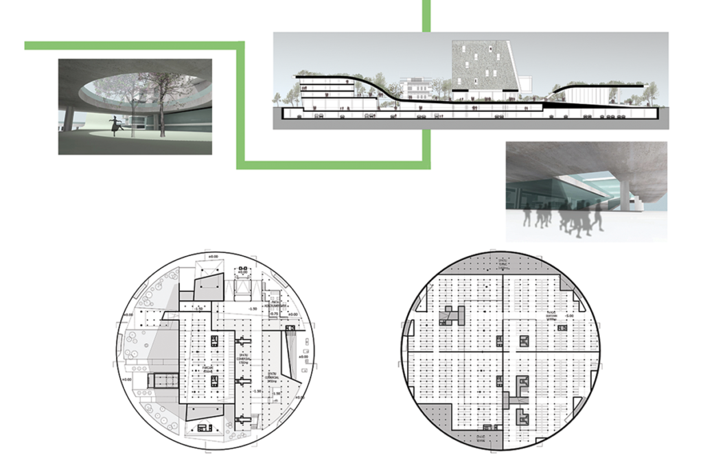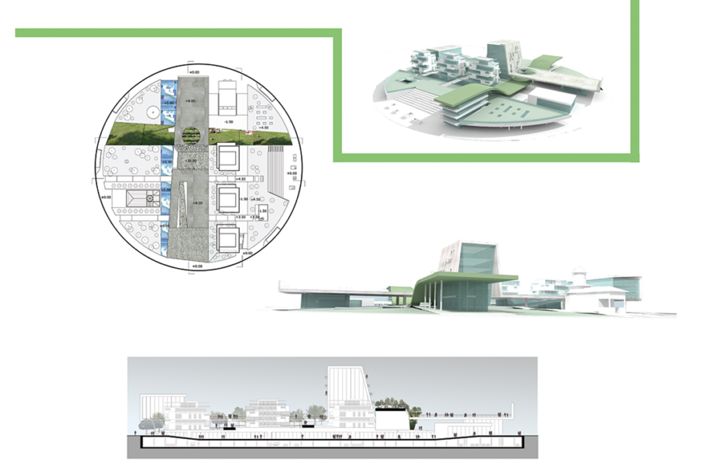 At the center of the proposal is a high-rise office building that has the ground plane rise and cover it in a way that makes it part of the urban public space but at the same time creates a central beacon for the project. Around this are a series of commercial and public plazas, creating an inverted donut with the center occupied by this building and a series of complementary spaces around it. This reverses the traditional plaza with the open area surrounded by buildings.