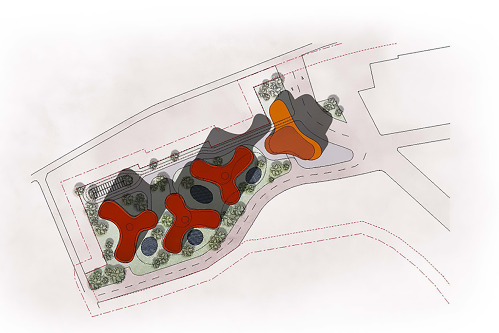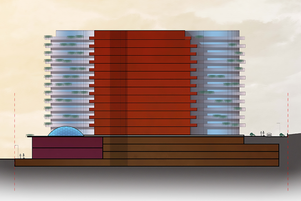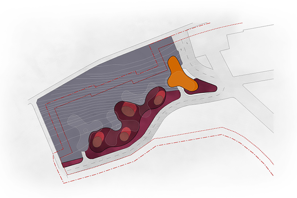 A three level common basement is designed to accommodate the parking as well as commercial and retail spaces. The wellbeing of the future inhabitants is further enhanced by a kindergarten, spaces for shared offices, trade, and public catering. The green terraces on top of the buildings seek to create additional community spaces and interactions.