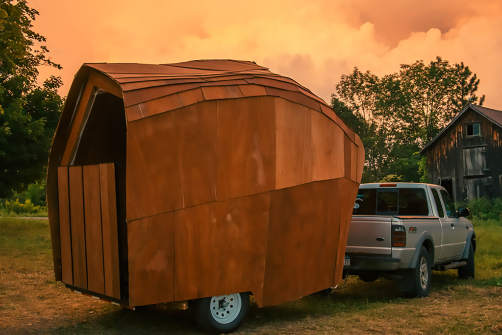 Touching Me Softly was a 2 week design-build workshop done by 20 students.that created a prototype tiny house on a small trailer. It was meant to be occupied by one or two people and to be used as a single room space that would be convertible from a bedroom to a dining or workspace and to a living room. To do this students were asked to map their bodies in positions of lying down, working, sitting; so that the space could be used for multiple functions. The interior became a negotiation of the space of the body between resting, sleeping, working, eating, relaxing and sitting.