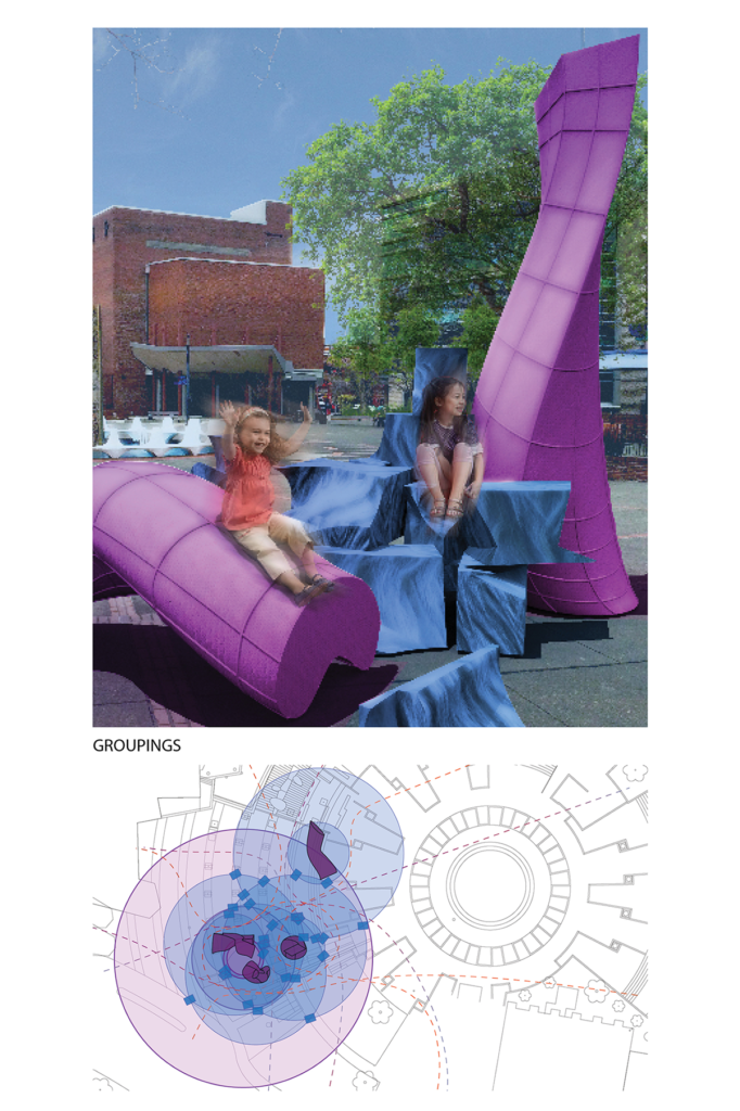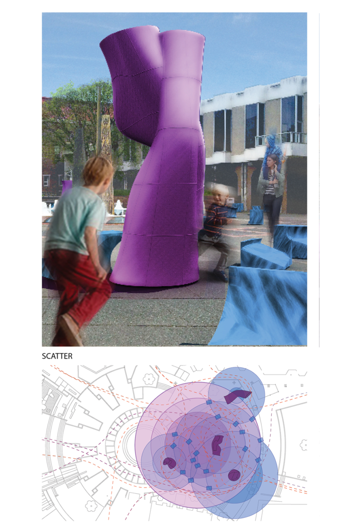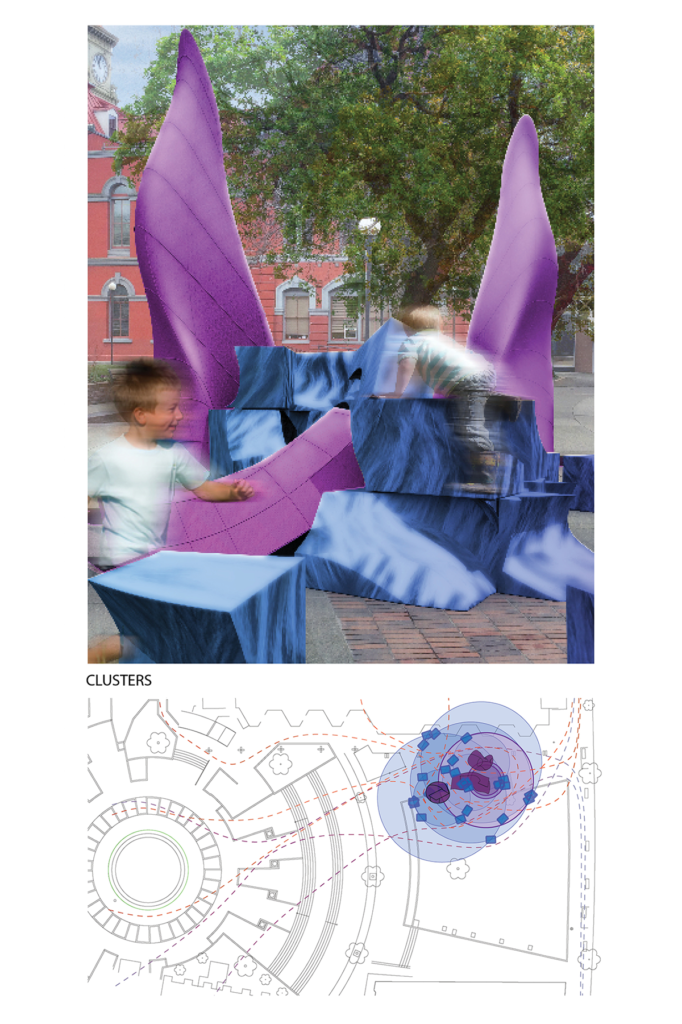 Our project approaches the question of play from how the choreography of the square can provide opportunities that are not immediately apparent. We propose four large catalysts and twenty to thirty smaller “dancers”. The catalysts act as icons and beacons in the square, referring as well to the totems at the entry and fountain. The positioning of the catalyst is flexible and can be adjusted based on any event or need that the city has. The dancers are smaller and can be moved by people that use the square to sit and have lunch or rearranged as part of a game or obstacle course by children and their parents.