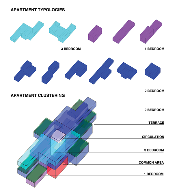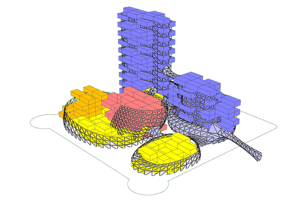Our explorations of Cellular Automata follow on the biological parallels setup by the RETICULAR NETWORK. The resulting system breaks up unified space, pixelating an already mixed use development. These pockets of public space work to integrate the uses of the site not only spatially but also socially, giving people somewhere to gather and enjoy the city. The reticular network creates the space in which the body public can grow and activate the city around it.