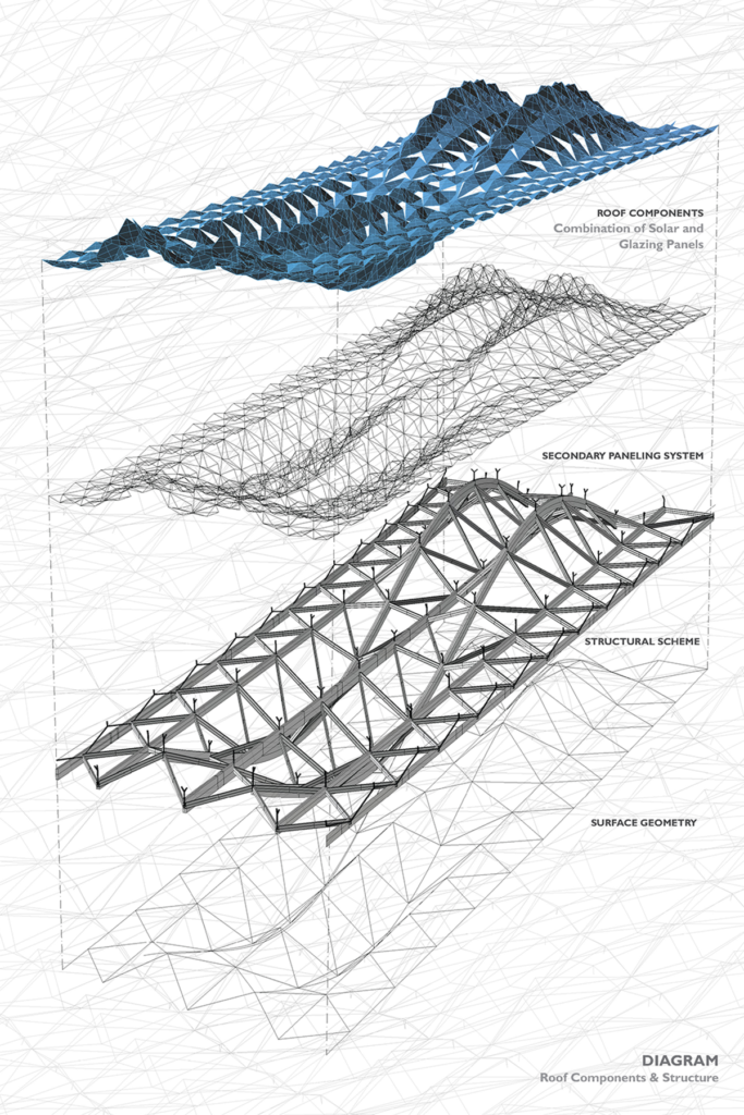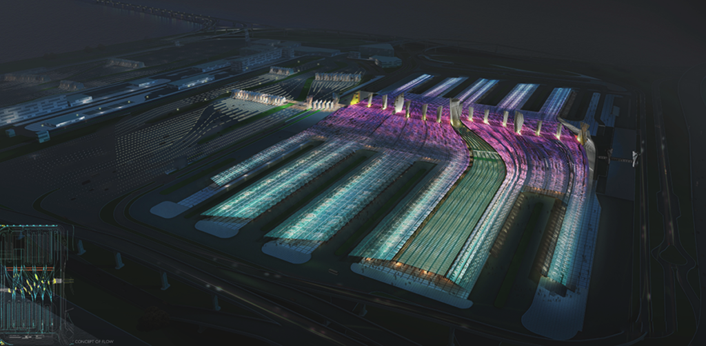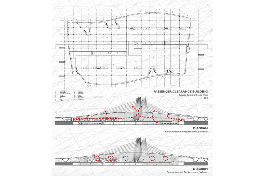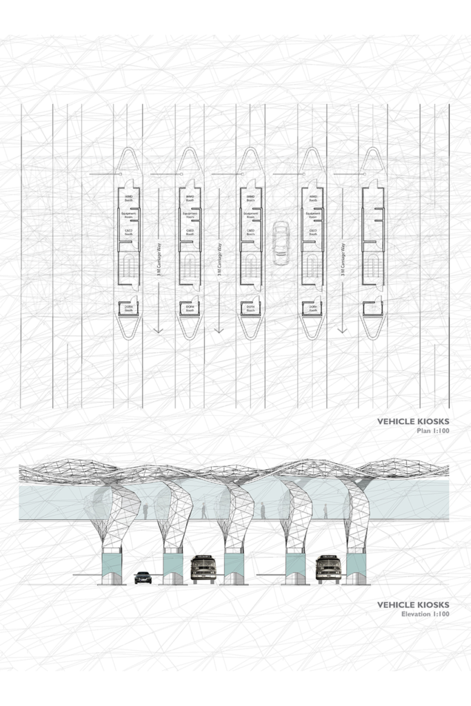 Three scales of differentiated masses aggregate along the linear border: structural elements supporting an undulating roof; kiosks for processing pedestrians and vehicles; and proposed buildings for future development. Through the control of the size, shape, orientation, and color of roofing components, gradients of porosity wash the interior with daylight. These openings, interrupted by solid masses marking the line of the border, a memorable experience of mobility is created at the HKBCF boundary crossing.
