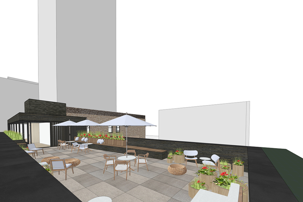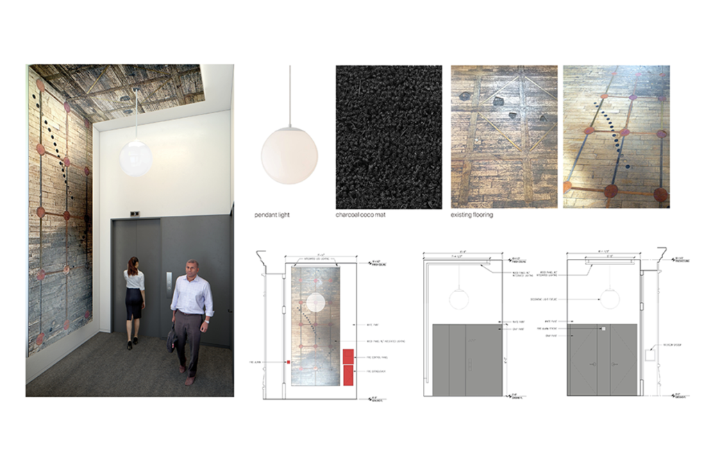 The new floor featured a brick screen in front of the entry from the landscaped roof terrace. The lobby brought the history of the building on display. On the 5th floor of the existing building there were 2 floor inlays, most likely done during the mid-20th century as part of the Fluxus art movement that was burgeoning in Soho at the time. The new office lobby uses these as accent elements on the wall and ceiling.