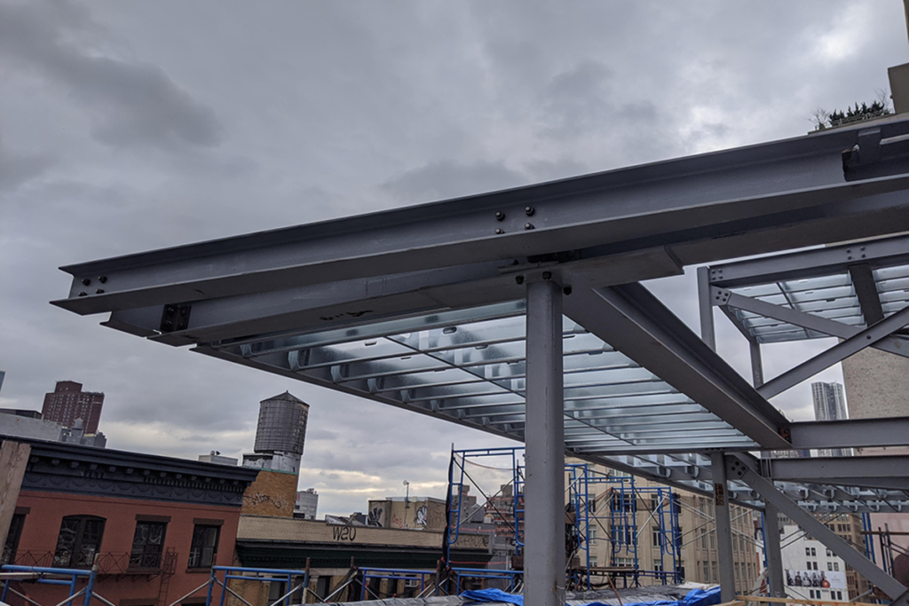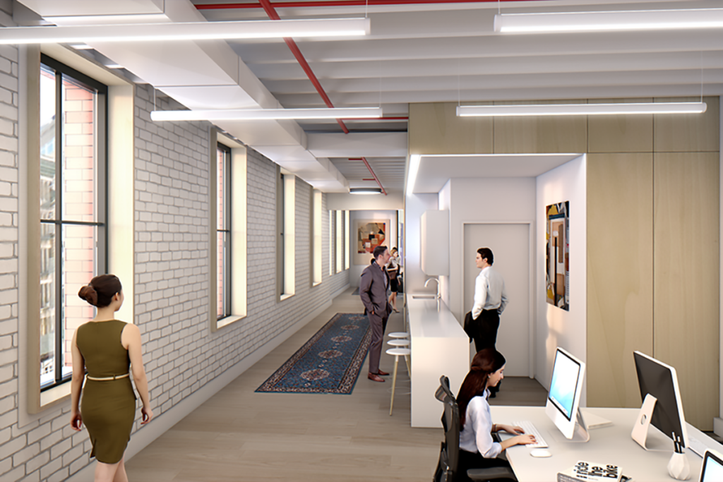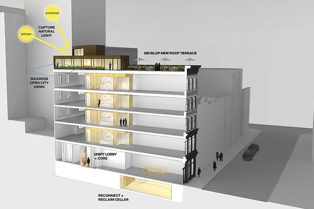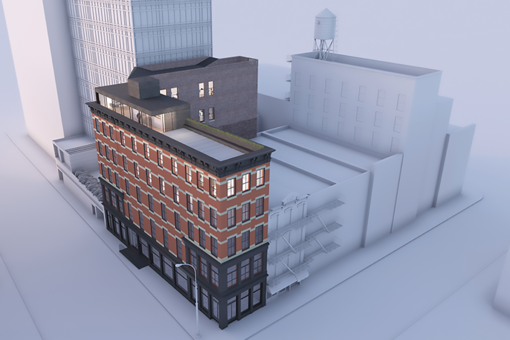 This was a project for a gut renovation and adding a floor to an existing building on the edge of the Soho Landmark District. The new space had an elevator core and added a stair on the back of the building. The new floor had to be set back from the edge of the building to have a minimum impact on the views of the building to meet LPC requirements. Adding the stair to the outside of the building allowed us to maximize the allowed floor area while maintaining these setbacks.