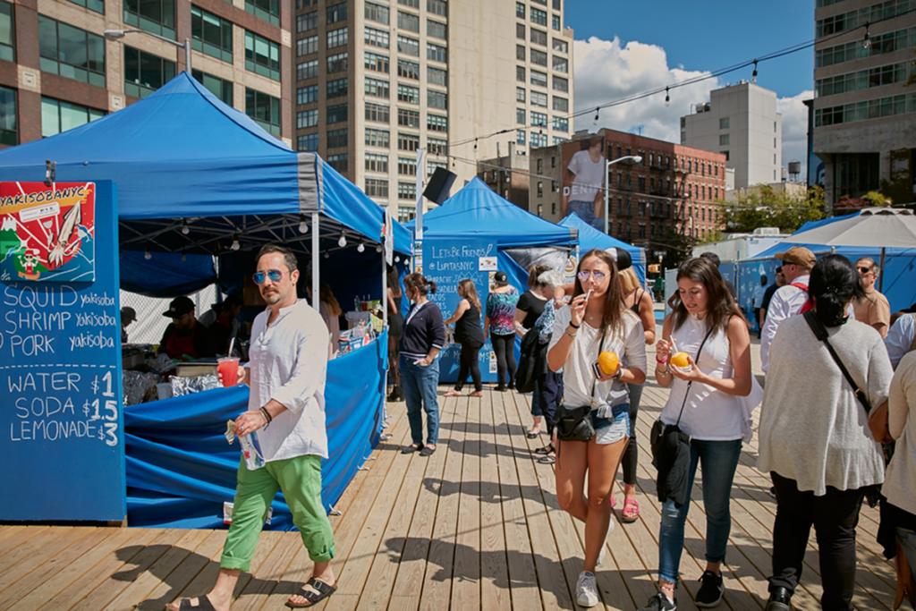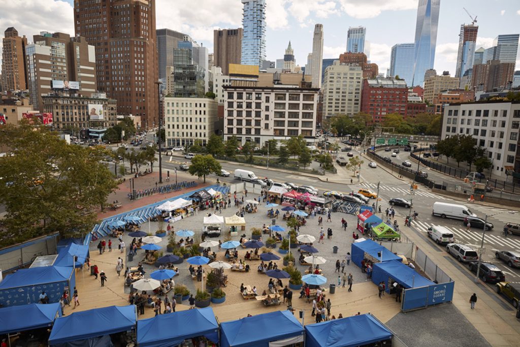 Smorg Square was the Manhattan outpost of the Smorgasburg food market. The design used shipping containers to house the pop-up food vendors. These were angled to give each vendor their own space. One of the containers was specially designed to function as a bar for the plaza. The graphics were designed in house and were both a logo and way-finding tool. They also became the starting point for the Smorg Fence workshop done with the Children’s Museum.